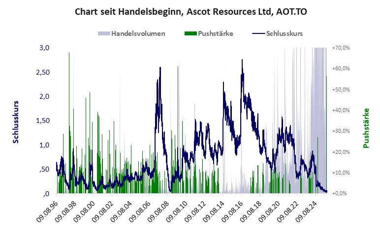Ascot Resources hat ein kritisches Gesamtscoring und ist ein mickriger Pennystock mit praktisch einem Totalverlust. Das Gesamtvermögen ist sehr groß, die Vermögenswerte scheinen nicht werthaltig zu sein, der Umsatz ist beträchtlich, die Ertragslage extrem verlustreich, die Geldverbrennung gering.