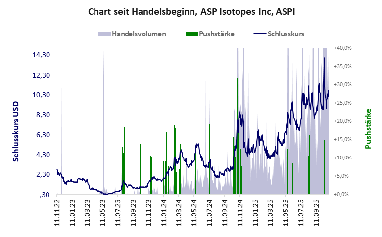 ein kleiner Mittelständler mit verlustreichem Betrieb und gepushtem Kurs. ASP Isotopes hat ein schwaches Gesamtscoring und ist eine günstige Aktie mit Kursgewinn. Das Gesamtvermögen ist beträchtlich, die Vermögenswerte scheinen noch werthaltig zu sein, der Umsatz ist überschaubar, die Ertragslage extrem verlustreich, die Geldverbrennung erträglich.