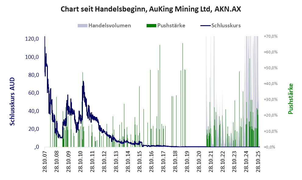 Bei dieser Aktie liegt das „Inkassomodell“ vor, bei dem der Aktienkurs zu Beginn der Geschichte sein Allzeithoch hat. Die Akteure verkaufen schon zu Beginn nach und nach ihre billigst erworbenen Aktien, so dass der Kurs in verhältnismäßig kurzer Zeit abstürzt. Danach dümpelt der Aktienkurs in den meistn Fällen nahe null dahin und die Aktie dient nur noch kleineren, dennoch gewinnbringenden Pushmanövern und in vielen Fällen dem Algotrading. Dem ersten Einbruch nachfolgende größere Pushmanöver sind aber nicht ausgeschlossen.