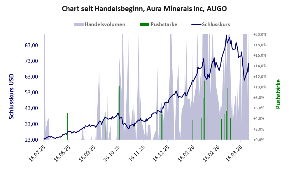 Über diese Aktie berichtet w:o. Das tägliche Handelsvolumen betrug an obiger Börse während der letzten drei Monate bis Berichtsdatum: 981.338 Stück, das sind 1,2% der ausgegebenen Aktien. Die hohe Geldverbrennung in der Explorationsphase von Aura Minerals hat sich gelohnt. Die Produktion wurde aufgenommen, ist aber noch unprofitabel.
