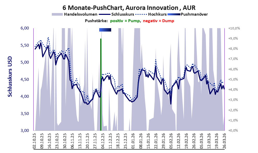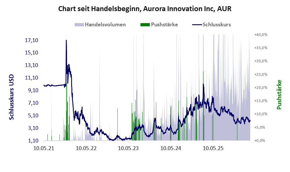 Das tägliche Handelsvolumen betrug an obiger Börse während der letzten drei Monate bis Berichtsdatum: 18.067.108 Stück, das sind 1,1% der ausgegebenen Aktien. Bei Aurora Innovation wird bei schwachen operativen Geschäft zu viel Geld verbrannt.