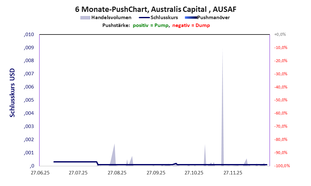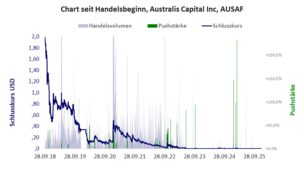 Bei dieser Aktie liegt das „Inkassomodell“ vor, bei dem der Aktienkurs zu Beginn der Geschichte sein Allzeithoch hat. Die Akteure verkaufen schon zu Beginn nach und nach ihre billigst erworbenen Aktien, so dass der Kurs in verhältnismäßig kurzer Zeit abstürzt. Danach dümpelt der Aktienkurs in den meistn Fällen nahe null dahin und die Aktie dient nur noch kleineren, dennoch gewinnbringenden Pushmanövern und in vielen Fällen dem Algotrading. Dem ersten Einbruch nachfolgende größere Pushmanöver sind aber nicht ausgeschlossen. Bei dieser Aktie vollzogen die Akteure mindestens einen Pump & Dump und leerten damit ganz gezielt die Taschen der Anleger. Obwohl das Vorgehen rechtswidrig ist, erfolgt kaum je eine Strafverfolgung.