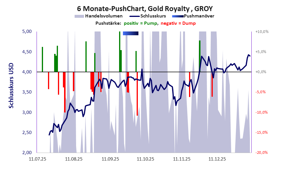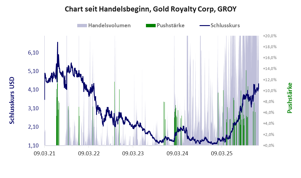 Das Gold Royalty Modell überzeugt die Anleger wenig. Trotz massiven Pushmanövers ist der Kurs wieder im Sinkflug. Eine Pusheraktie mit Substanz.