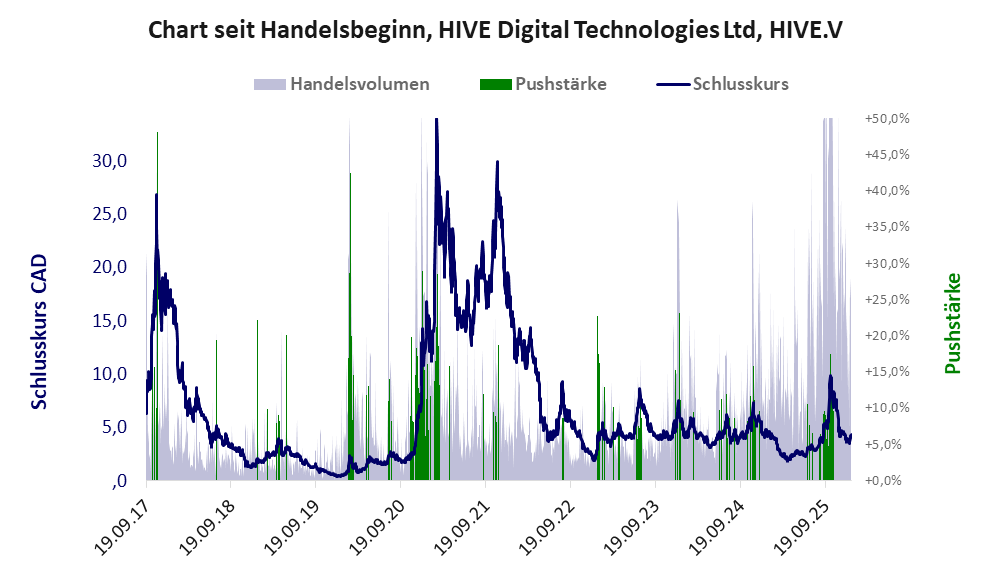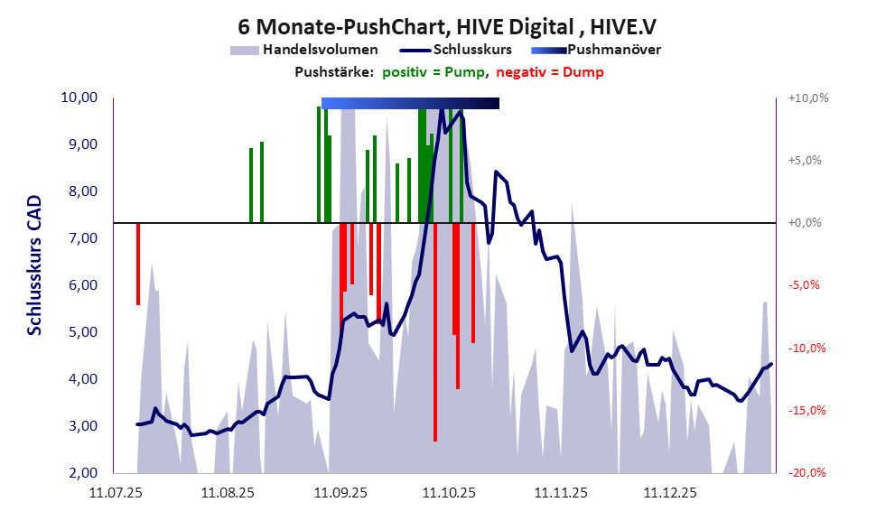 Unternehmen mit operativem Betrieb, der Anleger nicht überzeugt. Kurs muss gepusht werden. Das Pushmuster deutet auf ein halbjährliches Wiedervorlage-Schema hin.