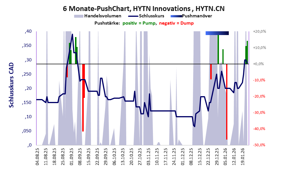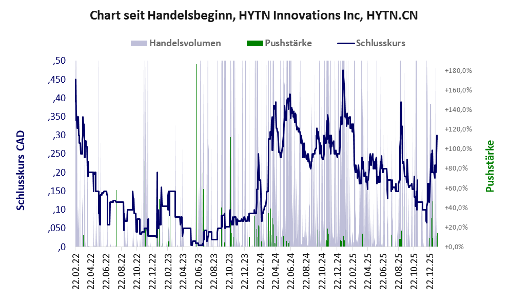 Ein Winzling und eine wertlose Firma, deren Aktie dem Kurspushing dient. HYTN verbrennt seit 2022 gut fünf Millionen CAD pro Jahr, hat kaum Umsatz und keinen Gewinn. Hauptaktivität scheinen die von Bullvestor begleiteten starken Pushmanöver zu sein, aus denen HYTN in kurzer Zeit fast 15 Millionen CAD je Million Einsatz gewonnen haben dürfte. *** Es gab 2 Pump&Dump-Manöver.
