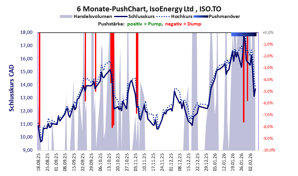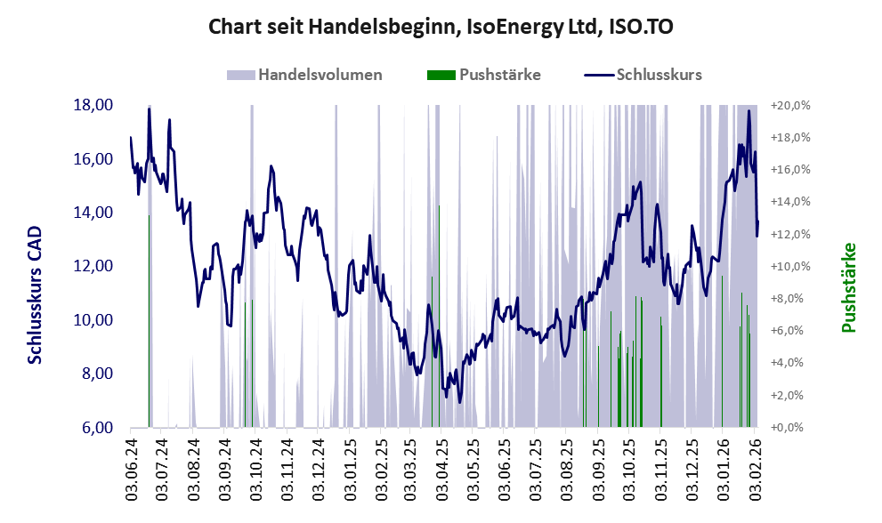 IsoEnergy Ltd besticht in erster Linie durch die hohe jährliche Geldverbrennung. Über diese Aktie berichtet SRC. Das tägliche Handelsvolumen betrug an obiger Börse während der letzten drei Monate bis Berichtsdatum: 207.682 Stück, das sind 0,3% der ausgegebenen Aktien.