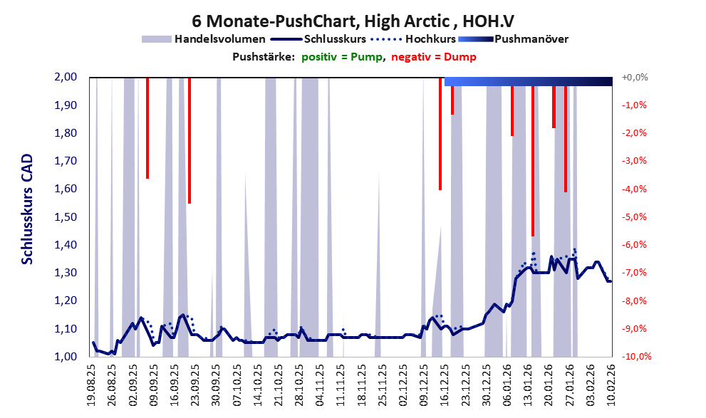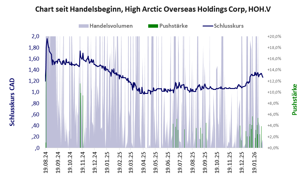 Das tägliche Handelsvolumen betrug an obiger Börse während der letzten drei Monate bis Berichtsdatum: 3.779 Stück, das sind 0,0% der ausgegebenen Aktien. Bei High Arctic liegt ein ordentlicher Geschäftsbetrieb vor.