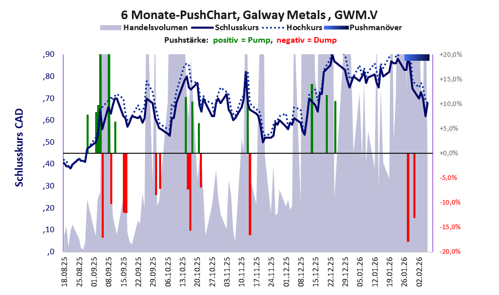 Bei dieser Aktie, über die w:o berichtet, liegt das Refreshmodell vor. Das tägliche Handelsvolumen betrug an obiger Börse während der letzten drei Monate bis Berichtsdatum: 874.754 Stück, das sind 0,7% der ausgegebenen Aktien. Da Galway Metals kaum Vermögen besitzt und unprofitabel ist, hat der Aktienkurs keinen Wert. Die Aktie dient in erster Linie Pushmanövern.
