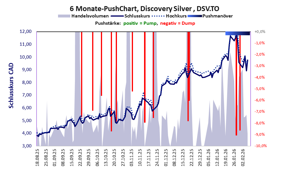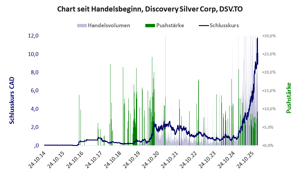 Discovery Silver besticht in erster Linie durch die hohe jährliche Geldverbrennung. Über diese Aktie berichtet JS Research. Das tägliche Handelsvolumen betrug an obiger Börse während der letzten drei Monate bis Berichtsdatum: 4.643.022 Stück, das sind 0,6% der ausgegebenen Aktien.