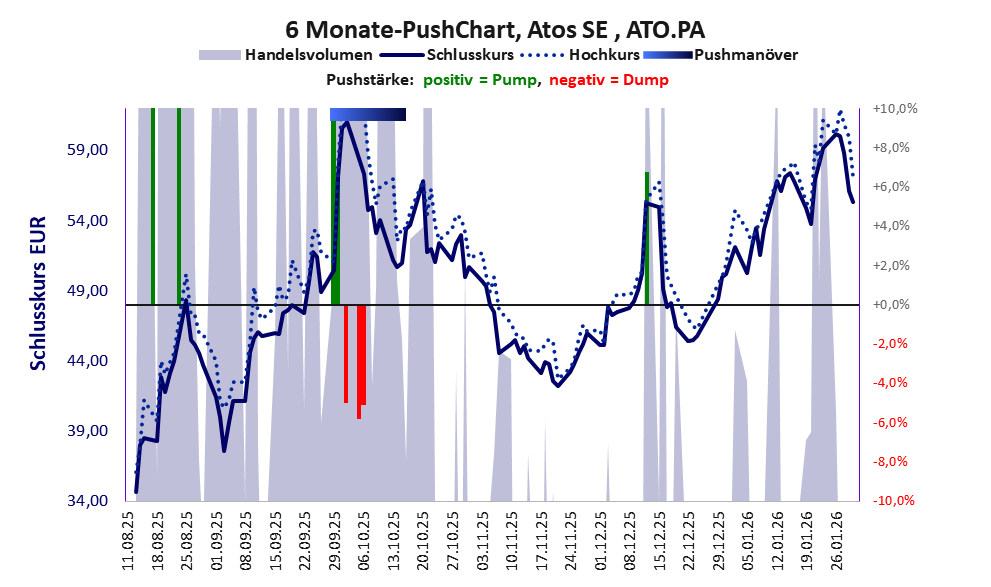Atos hat die Turbulenzen des letzten Jahres einschließlich des unerklärlichen Pushmanövers im Nov./Dez. 2024 (Bildletzte 12 Monate Atos SE und Bildletzter Push Atos SE) überwunden. Der Aktienkurs liegt seit dem reverse split auf einem attraktiven Niveau. Kritisch erscheinen das enorm gestiegene Handelsvolumen (Algotrading?) und Kursschwankungen, die bei anderen Aktien als Pushmanöver zu werten sind und in der Bewertung zu dem für diese Aktie ungewöhnlich hohen PushScore führen. Die Finanzlage hat sich erkennbar verbessert, die Pushstärke der Aktie bleibt hoch.