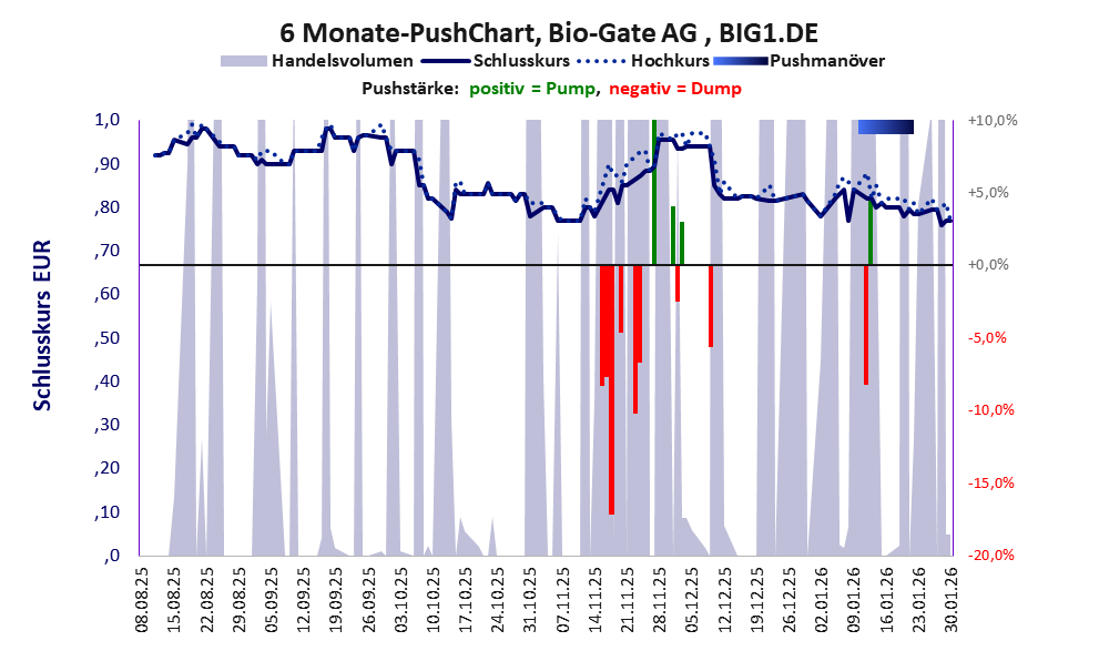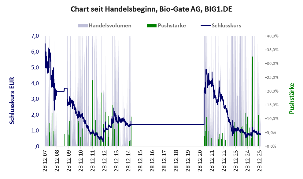GBC belegte die Aktie im Auftrag von Bio-Gate zwar wiederholt mit einer Kaufempfehlung, was auch vorübergehend zu einem Kursanstieg um 70% führte, aber nicht verhinderte, dass der Kurs insgesamt stark fiel. Das Scoring ist nicht dazu angetan, an eine Stärke der Aktie zu glauben.