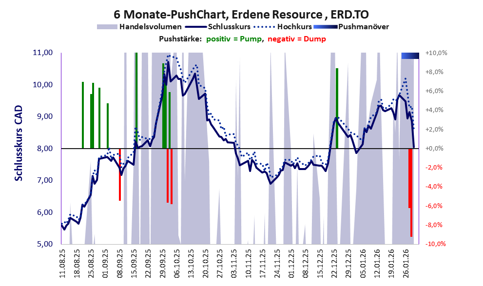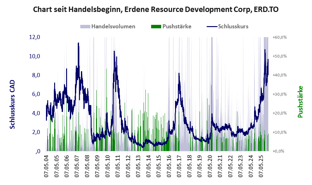 Erdene Resource hatte operativ seit über 20 Jahren keinen Erfolg, aber Ende 2025 ging Erdene mit der Bayan Khundii Gold Mine in Produktion. Damit findet der seit Ende 2023 deutlich gestiegene Aktienkurs eine solide Basis und befreit von der in zurückliegenden Jahren immer zu stellenden Frage, Pusheraktie oder nicht. Erdene hat es geschafft, in Produktion zu gehen!