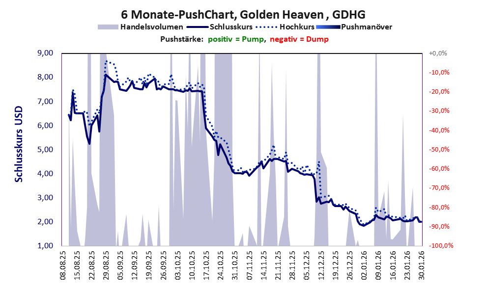 Golden Heaven zählt zu einer Gruppe chinesischer Firmen deren Aktien in den USA oder auf den Antillen beheimatet sind und die auf der Warnliste der BaFin stehen. Der Aktienkurs dieser Firmen zeigt schlagartig durchgeführte Dumps, mit denen die Anleger (oft in Chatgruppen organisiert) um ihr Geld betrogen wurden. Die Geschichte, wie abgezockt wird, steht unter Am Handy abgezockt..