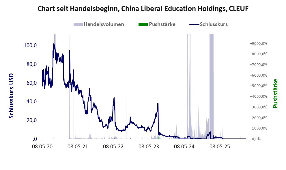 China Liberal Education zählt zu einer Gruppe chinesischer Firmen deren Aktien in den USA oder auf den Antillen beheimatet sind und die großteils auf der Warnliste der BaFin stehen. Der Aktienkurs dieser Firmen zeigt schlagartig durchgeführte Dumps, mit denen die Anleger (oft in Chatgruppen organisiert) um ihr Geld betrogen wurden. Charakteristisch ist für die meisten dieser Firmen, dass ihr Scoring meist recht gut und einer der Gründe ist, Anleger erfolgreich hinter das Licht geführt zu haben. Die Pushstärke zeigt allerdings das Risiko auf. Die Geschichte, wie abgezockt wird, steht unter Am Handy abgezockt.