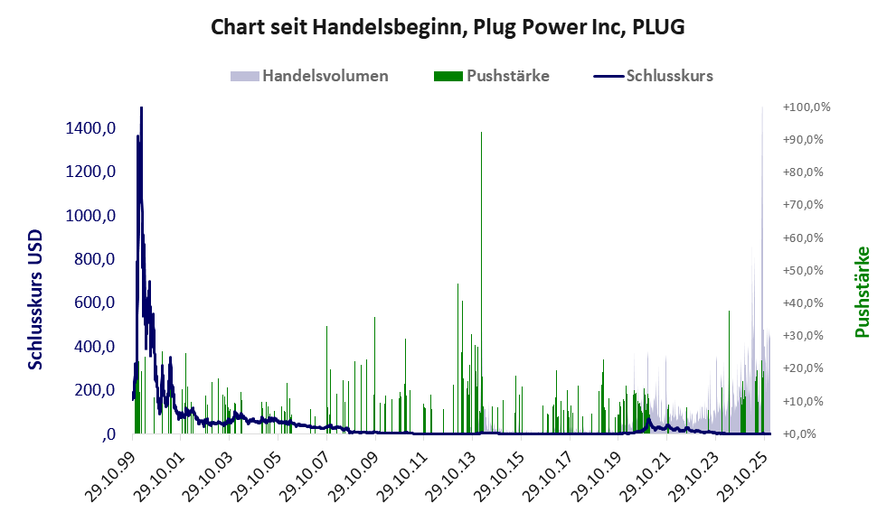Der Aktienkurs raste zu Beginn durch den Hydrogen-Hype hoch, um ebenso rasant abzustürzen. Seit einiger Zeit kämpft die Aktie, um kein Pennystock zu werden. Daran änderte auch der Push im Oktober 2025 nichts.