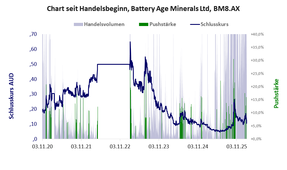 Bei dieser Aktie liegt das Refreshmodell vor. Das tägliche Handelsvolumen betrug an obiger Börse während der letzten drei Monate bis Berichtsdatum: 1.316.599 Stück, das sind 0,6% der ausgegebenen Aktien. Da Battery Age kaum Vermögen besitzt und unprofitabel ist, hat der Aktienkurs keinen Wert. Die Aktie dient in erster Linie Pushmanövern.