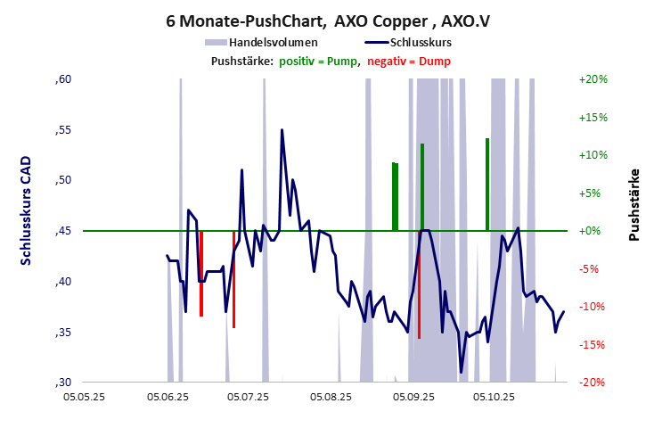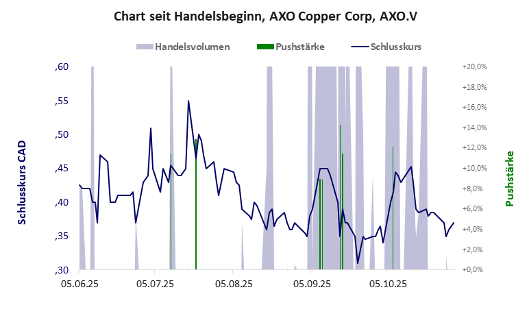 AXO Copper Corp (Mining Sektor) ist ein kleines kmU mit einem geringen Vermögen, das noch unbefleckt neu startet. AXO Copper hat ein mäßiges Gesamtscoring und ist ein kleiner Pennystock mit einem starken Kursverlust. Das Gesamtvermögen ist überschaubar, die Vermögenswerte scheinen sehr werthaltig zu sein, der Umsatz ist nicht existent, die Ertragslage extrem verlustreich, die Geldverbrennung gering.