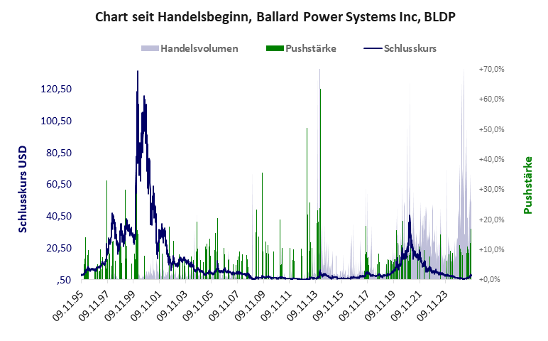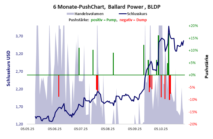Die Aktie hat schwer gelitten und durchlief Phasen wie sie für Pusheraktien typisch sind. Die Fuel Cell Technology hat bisher keinen Durchbruch erzielt und Großaufträge wie von Medien berichtet sind rar. Kein Wunder, dass der PushScore schlecht ist. . Ballard Power hat ein mäßiges Gesamtscoring und ist eine billige Aktie mit einem erträglichen Kursverlust. Das Gesamtvermögen ist sehr groß, die Vermögenswerte scheinen nicht werthaltig zu sein, der Umsatz ist groß, die Ertragslage extrem verlustreich, die Geldverbrennung extrem hoch.