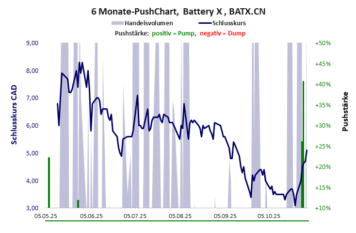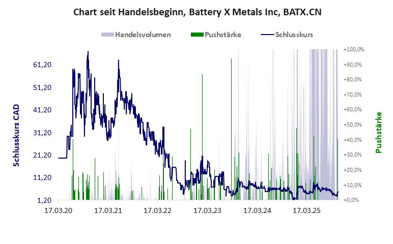 Battery X hat ein schlechtes Gesamtscoring und ist eine günstige Aktie mit einem riesigen Kursverlust. Das Gesamtvermögen ist karg, die Vermögenswerte scheinen sehr werthaltig zu sein, der Umsatz ist nicht existent, die Ertragslage extrem verlustreich, die Geldverbrennung extrem hoch.