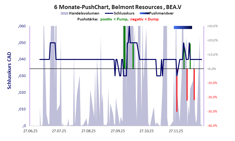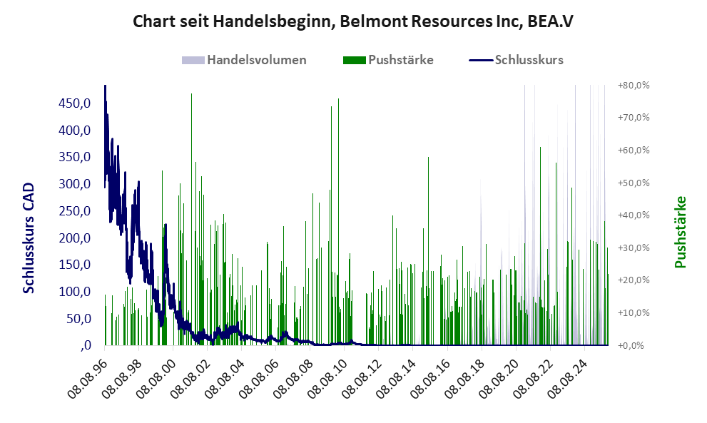 Bei dieser Aktie liegt das „Inkassomodell“ vor, bei dem der Aktienkurs zu Beginn der Geschichte sein Allzeithoch hat. Die Akteure verkaufen schon zu Beginn nach und nach ihre billigst erworbenen Aktien, so dass der Kurs in verhältnismäßig kurzer Zeit abstürzt. Danach dümpelt der Aktienkurs in den meistn Fällen nahe null dahin und die Aktie dient nur noch kleineren, dennoch gewinnbringenden Pushmanövern und in vielen Fällen dem Algotrading. Dem ersten Einbruch nachfolgende größere Pushmanöver sind aber nicht ausgeschlossen.