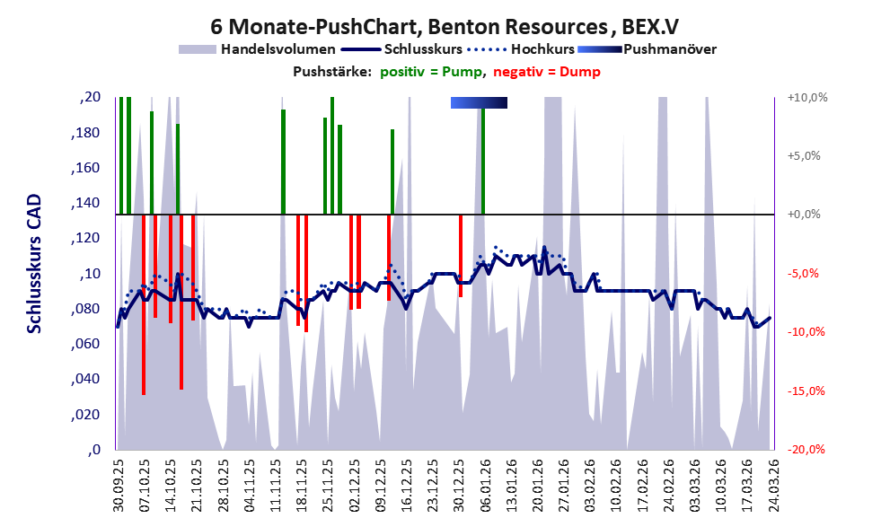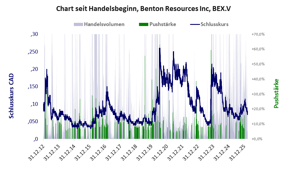Über diese Aktie berichtet Apaton. Das tägliche Handelsvolumen betrug an obiger Börse während der letzten drei Monate bis Berichtsdatum: 289.030 Stück, das sind 0,1% der ausgegebenen Aktien. Bei Benton Resources fehlt ein operatives Geschäft, stattdessen wird das Geld der Investoren verbrannt.