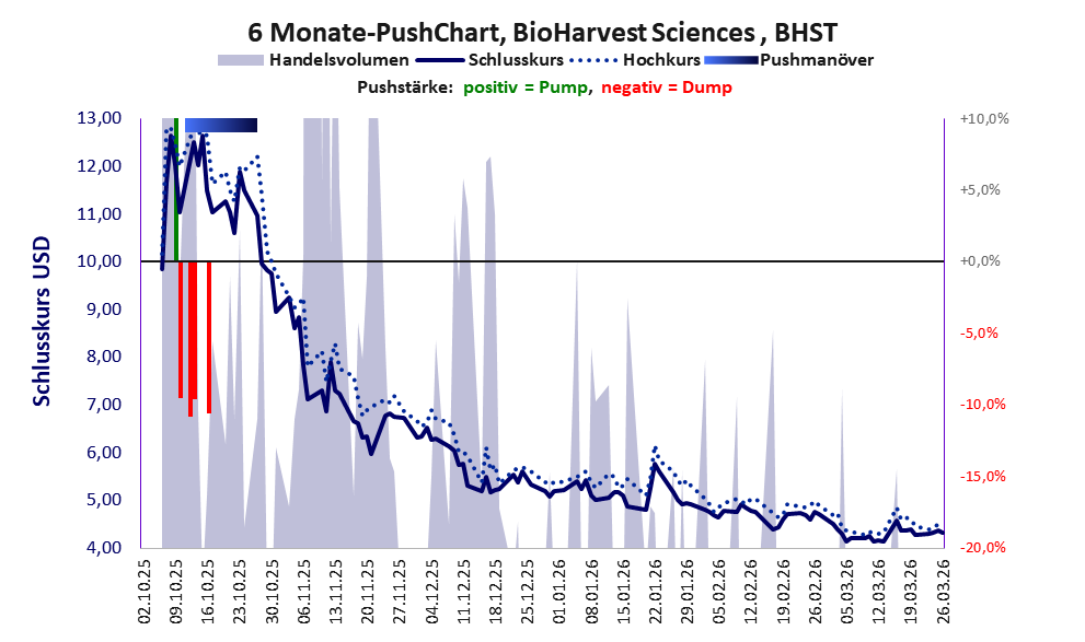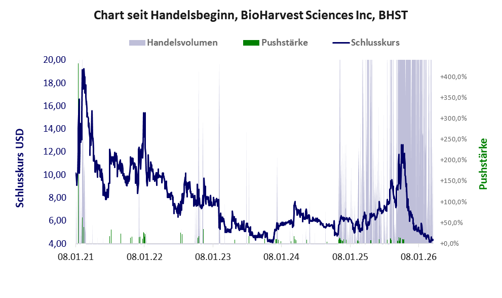 Über diese Aktie berichtet w:o. Das tägliche Handelsvolumen betrug an obiger Börse während der letzten drei Monate bis Berichtsdatum: 27.678 Stück, das sind 0,1% der ausgegebenen Aktien. Bei BioHarvest Sciences wird bei schwachen operativen Geschäft zu viel Geld verbrannt.