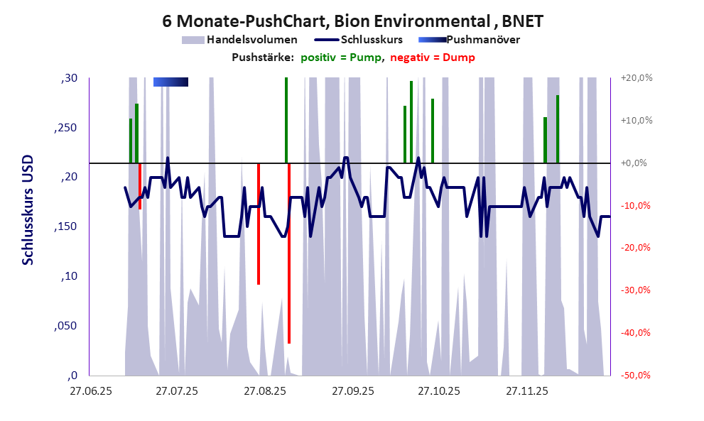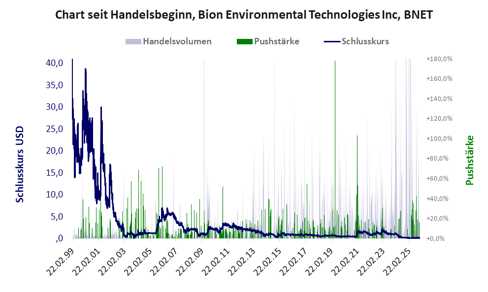 Dieser Aktie liegt das „Refreshmodell“ zu Grunde. Eine Durchsicht aller Geschäftsberichte würde recht sicher zeigen, dass das Unternehmen nie Umsatz und Profit erzielte und die gesamten Explorationskosten unter „Aktiva“ verbuchte. Das heißt, während aller Jahre wurde nichts gefunden, sondern die Investorengelder wurden für erfolglose Explorationsarbeiten verbrannt. Die bescheidene Exploration dient lediglich als Grundlage zur medialen Vermarktung von Erfolgsaussichten, auf eine große Lagerstätte zu stoßen, um damit das nächste Pushmanöver zu befeuern. Bei dieser Aktie liegt das „Inkassomodell“ vor, bei dem der Aktienkurs zu Beginn der Geschichte sein Allzeithoch hat. Die Akteure verkaufen schon zu Beginn nach und nach ihre billigst erworbenen Aktien, so dass der Kurs in verhältnismäßig kurzer Zeit abstürzt. Danach dümpelt der Aktienkurs in den meistn Fällen nahe null dahin und die Aktie dient nur noch kleineren, dennoch gewinnbringenden Pushmanövern und in vielen Fällen dem Algotrading. Dem ersten Einbruch nachfolgende größere Pushmanöver sind aber nicht ausgeschlossen.