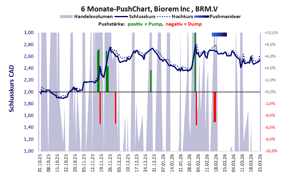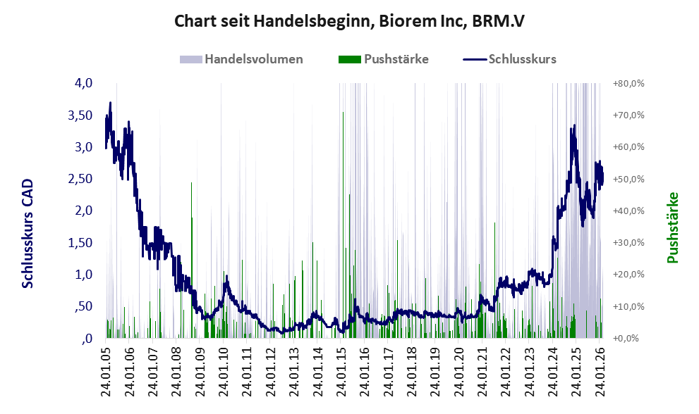 Das tägliche Handelsvolumen betrug an obiger Börse während der letzten drei Monate bis Berichtsdatum: 16.881 Stück, das sind 0,1% der ausgegebenen Aktien. Bei Biorem Inc liegt ein profitabler Geschäftsbetrieb vor.