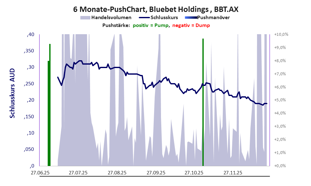 Bei dieser Aktie liegt das „Inkassomodell“ vor, bei dem der Aktienkurs zu Beginn der Geschichte sein Allzeithoch hat. Die Akteure verkaufen schon zu Beginn nach und nach ihre billigst erworbenen Aktien, so dass der Kurs in verhältnismäßig kurzer Zeit abstürzt. Danach dümpelt der Aktienkurs in den meistn Fällen nahe null dahin und die Aktie dient nur noch kleineren, dennoch gewinnbringenden Pushmanövern und in vielen Fällen dem Algotrading. Dem ersten Einbruch nachfolgende größere Pushmanöver sind aber nicht ausgeschlossen.