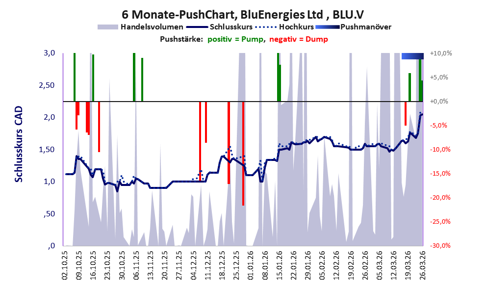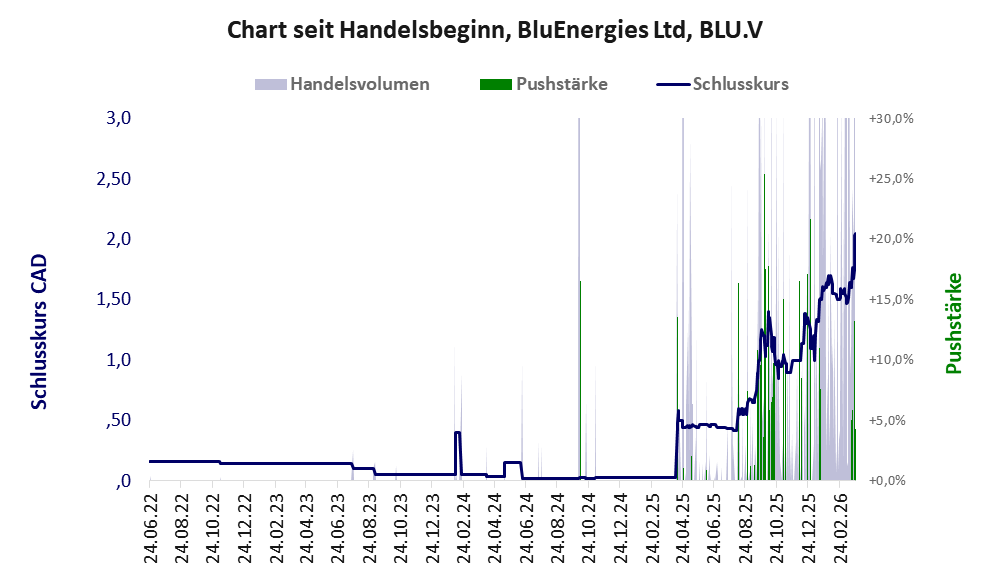 Das tägliche Handelsvolumen betrug an obiger Börse während der letzten drei Monate bis Berichtsdatum: 35.155 Stück, das sind 0,0% der ausgegebenen Aktien. Da BluEnergies Ltd kaum Vermögen besitzt und unprofitabel ist, hat der Aktienkurs keinen Wert. Die Aktie dient in erster Linie Pushmanövern.