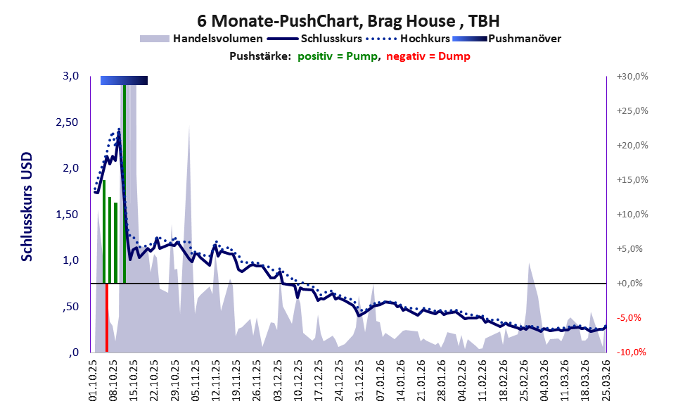 Brag House zählt zu einer Gruppe chinesischer Firmen deren Aktien in den USA oder auf den Antillen beheimatet sind und die auf der Warnliste der BaFin stehen. Der Aktienkurs dieser Firmen zeigt schlagartig durchgeführte Dumps, mit denen die Anleger (oft in Chatgruppen organisiert) um ihr Geld betrogen wurden. Brag House fällt bezüglich der Kenndaten aus der Rolle. Während es für die meisten dieser Firmen charakteristisch ist, dass ihr Scoring recht gut und einer der Gründe ist, Anleger erfolgreich hinter das Licht geführt zu haben, gilt dies bei Brag House nicht. Die Push- und Finanz-Scores sind schlecht. Nur die Pushstärke ist gut, weil Pushing erst gar nicht versucht, sondern gleich der „Dump-Hammer“ herausgeholt wurde.