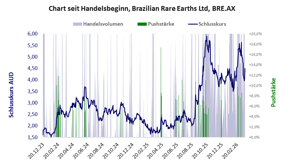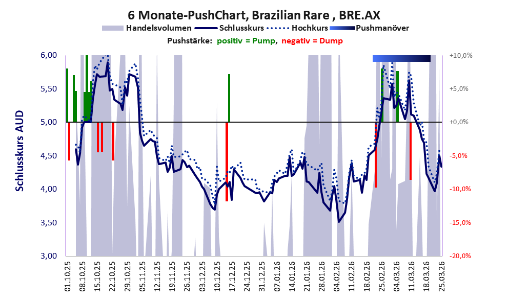 Das tägliche Handelsvolumen betrug an obiger Börse während der letzten drei Monate bis Berichtsdatum: 479.999 Stück, das sind 0,2% der ausgegebenen Aktien. Bei Brazilian Rare fehlt ein operativer Geschäftserfolg, stattdessen wird das Geld der Investoren im großen Stil verbrannt.