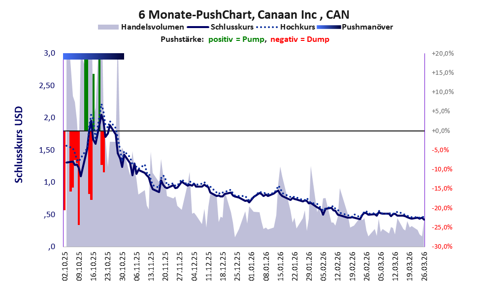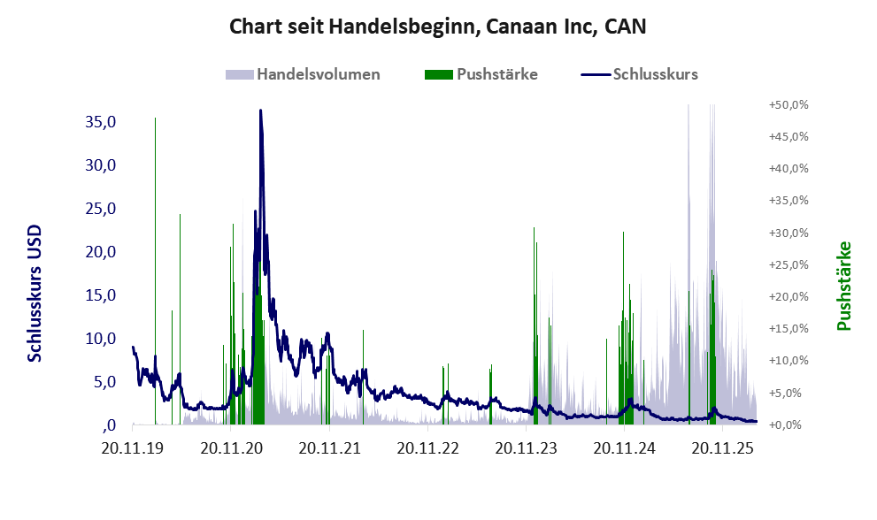 Das tägliche Handelsvolumen betrug an obiger Börse während der letzten drei Monate bis Berichtsdatum: 15.406.746 Stück, das sind 2,4% der ausgegebenen Aktien. Die hohe Geldverbrennung in der Investitionsphase von Canaan Inc hat sich gelohnt. Die Produktion wurde aufgenommen, ist aber noch unprofitabel.