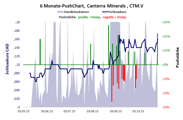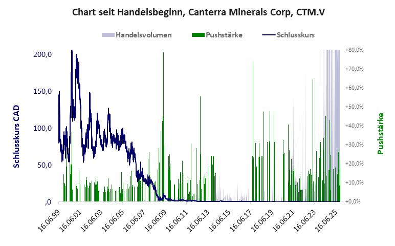 ein Miner mit ein paar aufgekauften, wertlosen Claims, der mit der Einbeziehung vom 03.12.2024 an der FWB ein Comeback versucht. Canterra Minerals hat ein kritisches Gesamtscoring und ist ein mickriger Pennystock mit praktisch einem Totalverlust. Das Gesamtvermögen ist überschaubar, die Vermögenswerte scheinen sehr werthaltig zu sein, der Umsatz ist nicht existent, die Ertragslage extrem verlustreich, die Geldverbrennung extrem hoch.