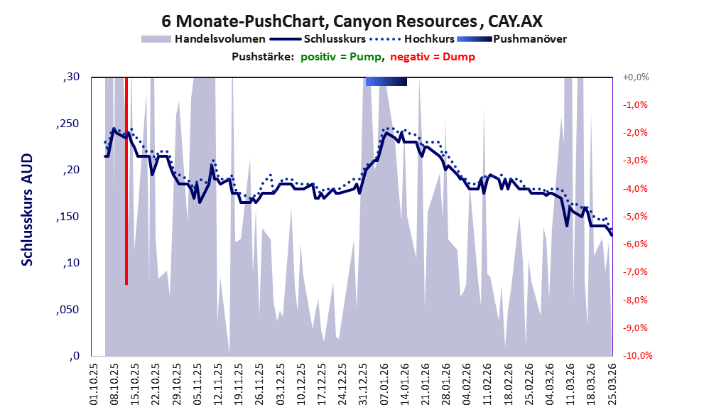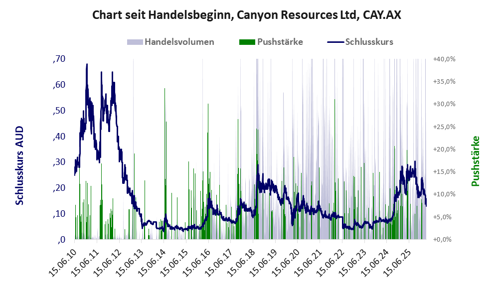 Über diese Aktie berichtet w:o. Das tägliche Handelsvolumen betrug an obiger Börse während der letzten drei Monate bis Berichtsdatum: 1.077.439 Stück, das sind 0,1% der ausgegebenen Aktien. Bei Canyon Resources fehlt ein operatives Geschäft, stattdessen wird das Geld der Investoren verbrannt.