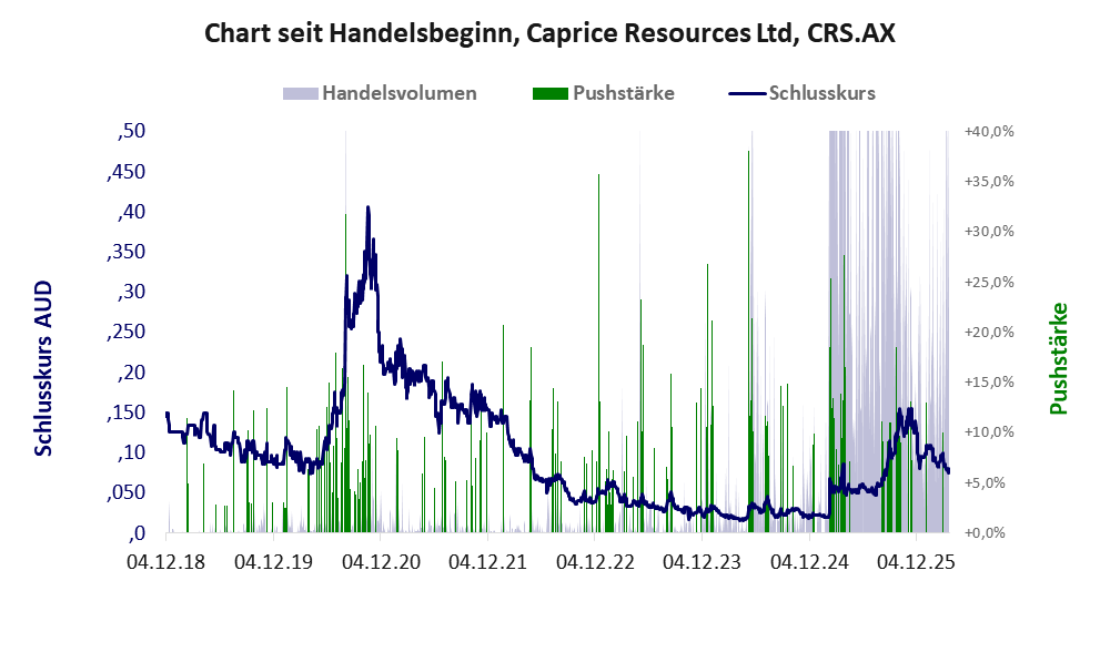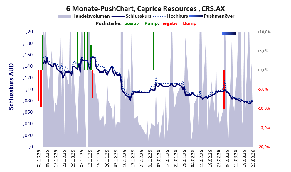 Über diese Aktie berichtet w:o. Das tägliche Handelsvolumen betrug an obiger Börse während der letzten drei Monate bis Berichtsdatum: 2.578.489 Stück, das sind 0,3% der ausgegebenen Aktien. Da Caprice Resources kaum Vermögen besitzt und unprofitabel ist, hat der Aktienkurs keinen Wert. Die Aktie dient in erster Linie Pushmanövern.