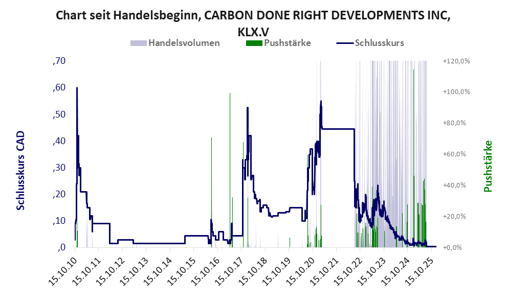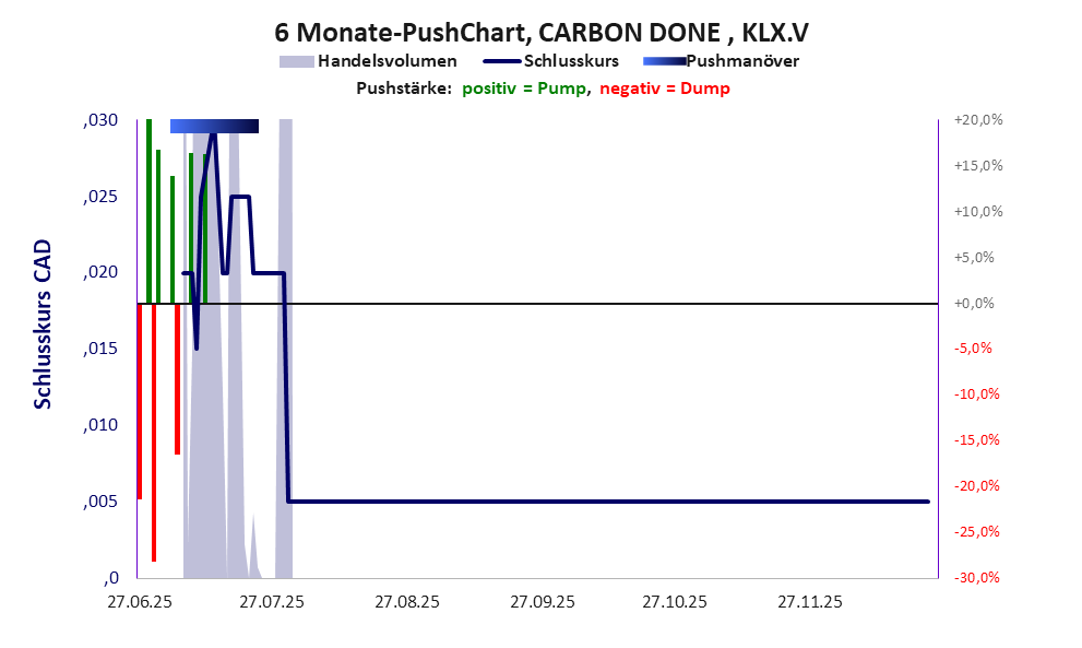 Bei dieser Aktie liegt das „Inkassomodell“ vor, bei dem der Aktienkurs zu Beginn der Geschichte sein Allzeithoch hat. Die Akteure verkaufen schon zu Beginn nach und nach ihre billigst erworbenen Aktien, so dass der Kurs in verhältnismäßig kurzer Zeit abstürzt. Danach dümpelt der Aktienkurs in den meistn Fällen nahe null dahin und die Aktie dient nur noch kleineren, dennoch gewinnbringenden Pushmanövern und in vielen Fällen dem Algotrading. Dem ersten Einbruch nachfolgende größere Pushmanöver sind aber nicht ausgeschlossen.