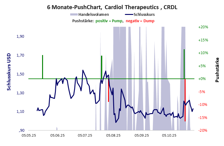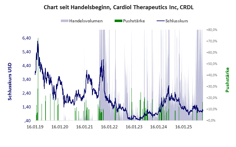 die Bilanz besteht nur aus Cash. Net Assets gibt es keine, d.h. es gibt keinen operativen Betrieb. Die F&E-Arbeit – es wird unterstellt, es gibt solche – wird in Fremdleistung gegen Cash erbracht. Die Aktie dient demzufolge in erster Linie der Kursgestaltung, wie die Kursspitzen nahelegen. Ob es zu einem Forschungserfolg kommt, weiß niemand. Wieder ein FallTop oder Flop. Ob der Cardiol Therapeutics hat ein schlechtes Gesamtscoring und ist eine billige Aktie mit einem riesigen Kursverlust. Das Gesamtvermögen ist überschaubar, die Vermögenswerte scheinen nicht vorhanden zu sein, der Umsatz ist nicht existent, die Ertragslage extrem verlustreich, die Geldverbrennung extrem hoch.