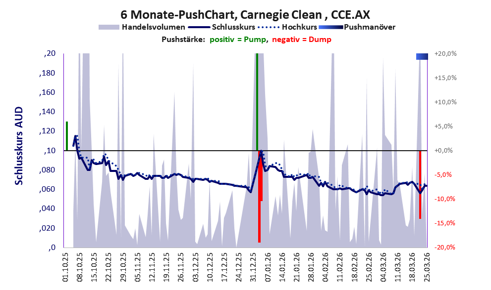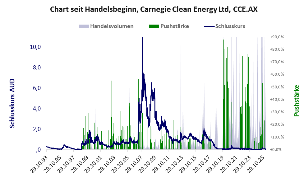 Bei dieser Aktie, über die w:o berichtet, gibt es 1 Pump & Dump-Manöver. Das tägliche Handelsvolumen betrug an obiger Börse während der letzten drei Monate bis Berichtsdatum: 223.944 Stück, das sind 0,1% der ausgegebenen Aktien. Bei Carnegie Clean rechtfertigt das schwache operative Geschäft nicht die Geldverbrennung.
