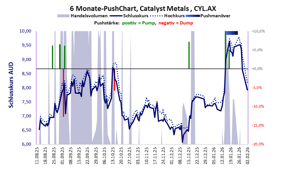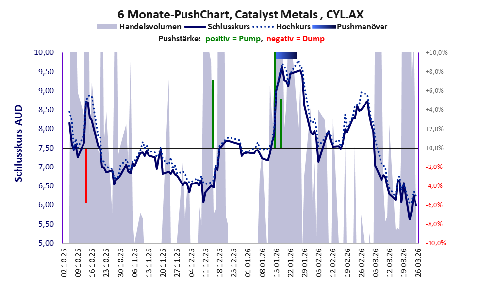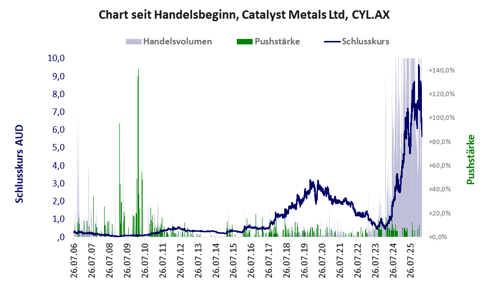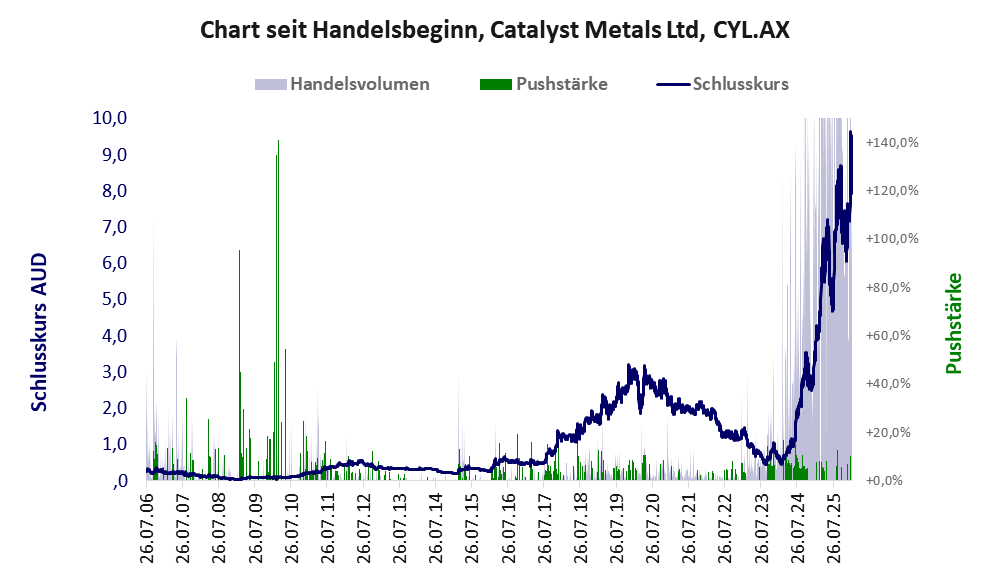 Die Wirtschaftsdaten von Catalyst Metals sind bestens, der PushScore weniger. Auffällig ist der exorbitante und schlagartige Anstieg des Handelsvolumens im Sommer 2024, der jedoch durch die starken Geschäftszahlen und das erstmalige Erreichen der Profitabilität erklärlich ist und jeden Verdacht auf eine Pusheraktie eliminierte. Der Goldpreisboom unterstützt die Performance der Aktie.