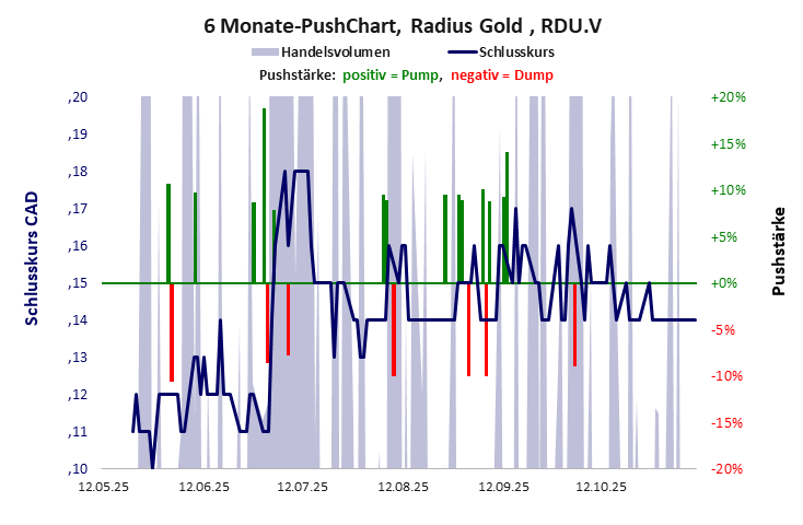 Radius Gold hat ein schlechtes Gesamtscoring in Klasse D. Es ist ein mickriger Pennystock mit einem starken Kursverlust. Das Gesamtvermögen ist karg, die Vermögenswerte scheinen wenig werthaltig zu sein, der Umsatz ist nicht existent, die Ertragslage extrem verlustreich, die Geldverbrennung extrem hoch.