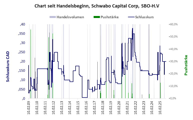 Schwabo Capital hat ein sehr schlechtes Scoring in Klasse D. Es ist ein mickriger Pennystock mit Kursgewinn. Das Gesamtvermögen ist nahezu null, die Vermögenswerte scheinen nicht vorhanden zu sein, der Umsatz ist nicht existent, die Ertragslage extrem verlustreich, die Geldverbrennung extrem hoch.