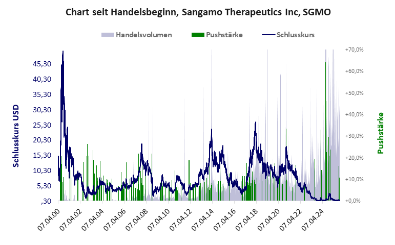 Sangamo Therapeutics hat ein schlechtes Scoring in Klasse C. Es ist ein Pennystock mit praktisch einem Totalverlust. Das Gesamtvermögen ist groß, die Vermögenswerte scheinen noch werthaltig zu sein, der Umsatz ist groß, die Ertragslage sehr verlustreich, die Geldverbrennung extrem hoch.