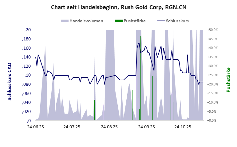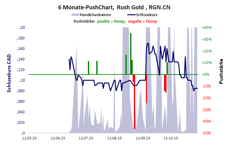 Rush Gold hat ein schlechtes Scoring in Klasse C. Es ist ein mickriger Pennystock mit einem erträglichen Kursverlust. Das Gesamtvermögen ist nahezu null, die Vermögenswerte scheinen werthaltig zu sein, der Umsatz ist nicht existent, die Ertragslage extrem verlustreich, die Geldverbrennung extrem hoch.