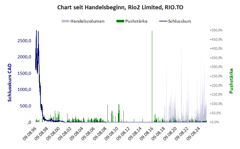 Rio2 Limited hat ein sehr schlechtes Scoring in Klasse D. Es ist eine billige Aktie mit praktisch einem Totalverlust. Das Gesamtvermögen ist groß, die Vermögenswerte scheinen sehr werthaltig zu sein, der Umsatz ist nicht existent, die Ertragslage schlecht, die Geldverbrennung erträglich.