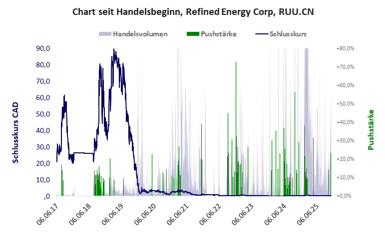 Refined Energy hat ein schlechtes Scoring in Klasse D. Es ist ein kleiner Pennystock mit praktisch einem Totalverlust. Das Gesamtvermögen ist karg, die Vermögenswerte scheinen wenig werthaltig zu sein, der Umsatz ist nicht existent, die Ertragslage extrem verlustreich, die Geldverbrennung extrem hoch.