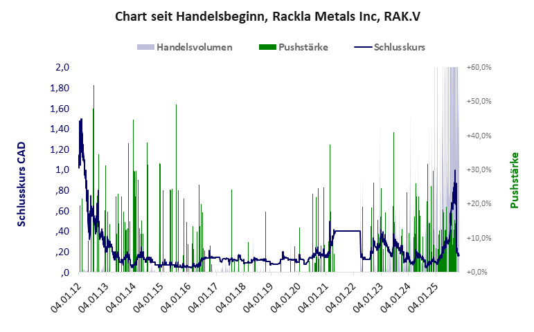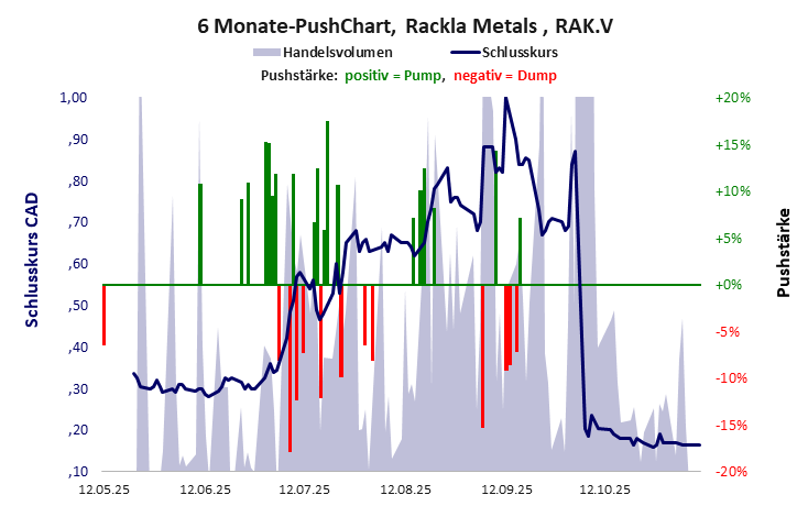 Rackla Metals hat ein schlechtes Scoring in Klasse D. Es ist ein mickriger Pennystock mit einem riesigen Kursverlust. Das Gesamtvermögen ist karg, die Vermögenswerte scheinen noch werthaltig zu sein, der Umsatz ist nicht existent, die Ertragslage extrem verlustreich, die Geldverbrennung extrem hoch.