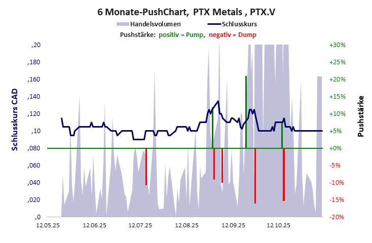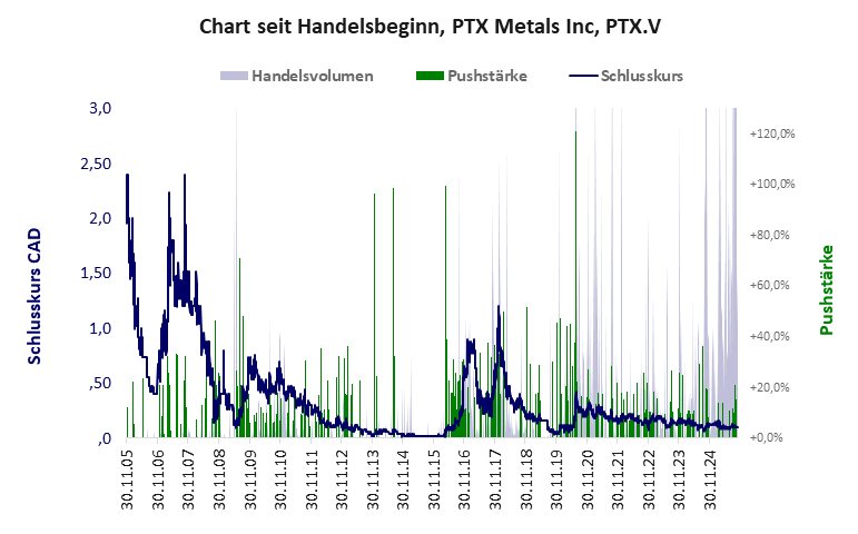 PTX Metals hat ein sehr schlechtes Scoring in Klasse D. Es ist ein mickriger Pennystock mit einem riesigen Kursverlust. Das Gesamtvermögen ist überschaubar, die Vermögenswerte scheinen sehr werthaltig zu sein, der Umsatz ist nicht existent, die Ertragslage extrem verlustreich, die Geldverbrennung sehr hoch.