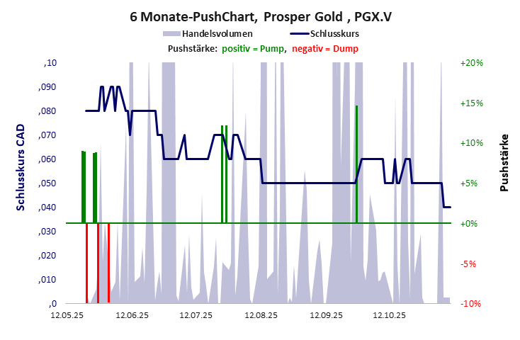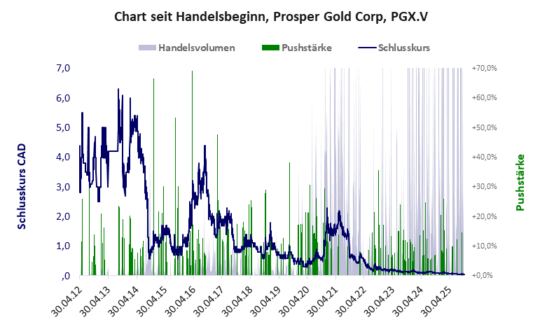 Prosper Gold hat ein schlechtes Scoring in Klasse D. Es ist ein mickriger Pennystock mit praktisch einem Totalverlust. Das Gesamtvermögen ist karg, die Vermögenswerte scheinen sehr werthaltig zu sein, der Umsatz ist nicht existent, die Ertragslage extrem verlustreich, die Geldverbrennung extrem hoch.