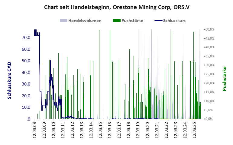 Orestone Mining hat ein sehr schlechtes Scoring in Klasse D. Es ist ein mickriger Pennystock mit praktisch einem Totalverlust. Das Gesamtvermögen ist karg, die Vermögenswerte scheinen nicht werthaltig zu sein, der Umsatz ist nicht existent, die Ertragslage extrem verlustreich, die Geldverbrennung extrem hoch.